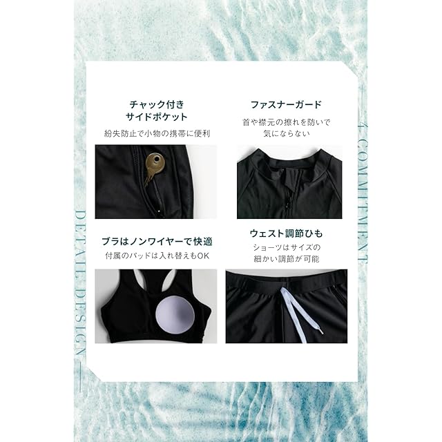 【 こだわりポイント 】 チャック付きのサイドポケットで 小物の紛失防止。 ファスナーガード / ストレスフリー の ノンワイヤー ブラ / ウエスト 調節ひも など、細かいところもしっかりサポートします。