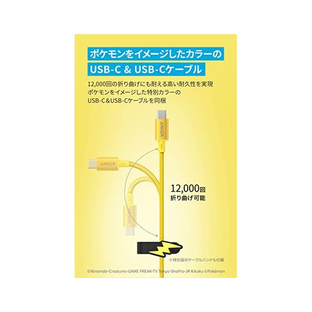 USB-C & USB-C ケーブル同梱:12,000回の折り曲げにも耐える高い耐久性を実現したUSB-C & USB-Cケーブルをポケモンに合わせたカラーの特別仕様で同梱しています。