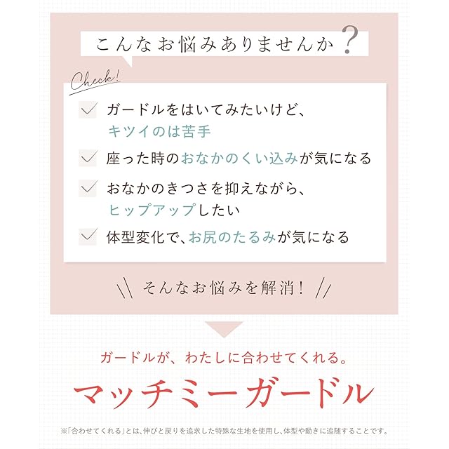 「マッチミーガードル」タテ・ヨコによく伸びてしっかり戻ってガードルが、わたしに合わせてくれる※「合わせてくれる」とは、伸びと戻りを追求した特殊な生地を使用し、体型や動きに追随することです。