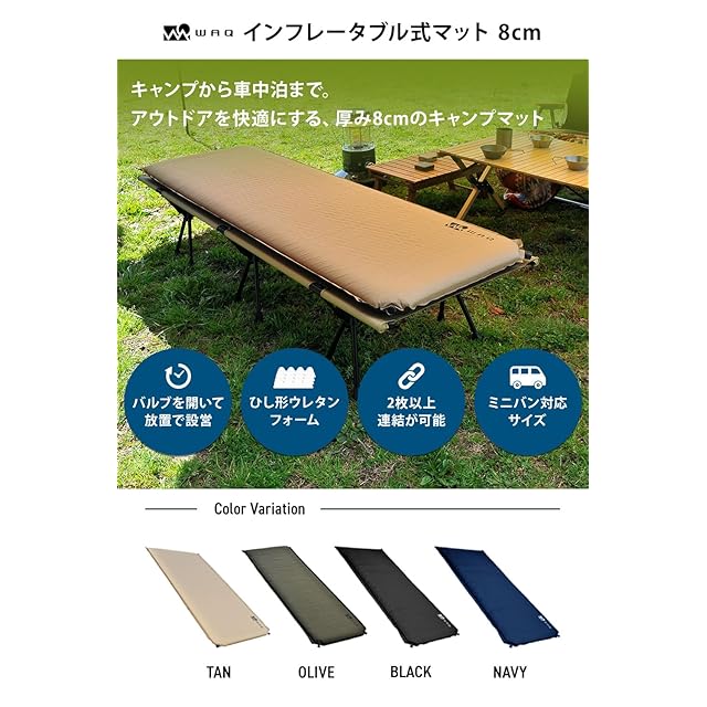 WAQ キャンプマット 車中泊マット 厚手 8cm コンパクト R値 6.5 特殊ウレタン 軽量 インフレーターマット (ブラック)