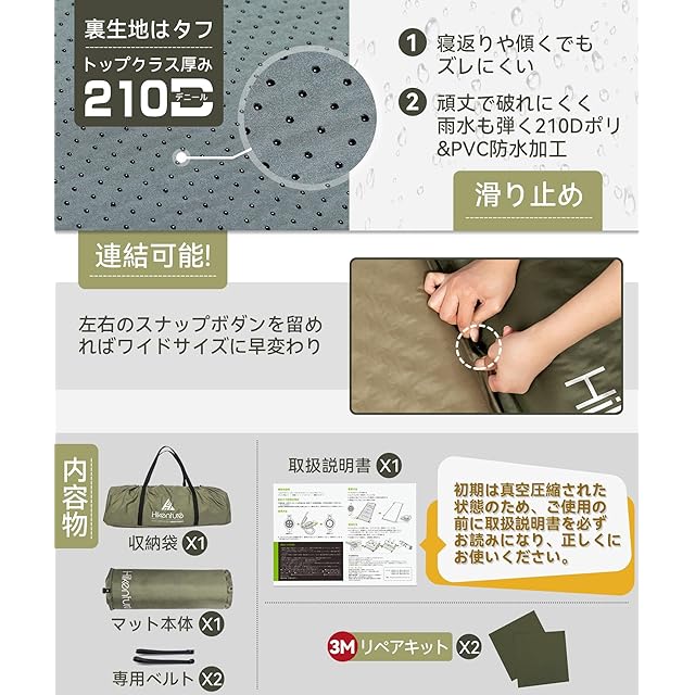 【無限連結・滑り止め加工】❶ 自動膨張エアーマットの両サイドに取り付け可能なボタンを設置、連結してタブルマットになり(192cm×140cm)、ミニバンやシングルボックス車での使用に適しています。❷ マット裏面には滑り止め加工を施していますのでフローリングの上や滑りやすい場所でも安定。