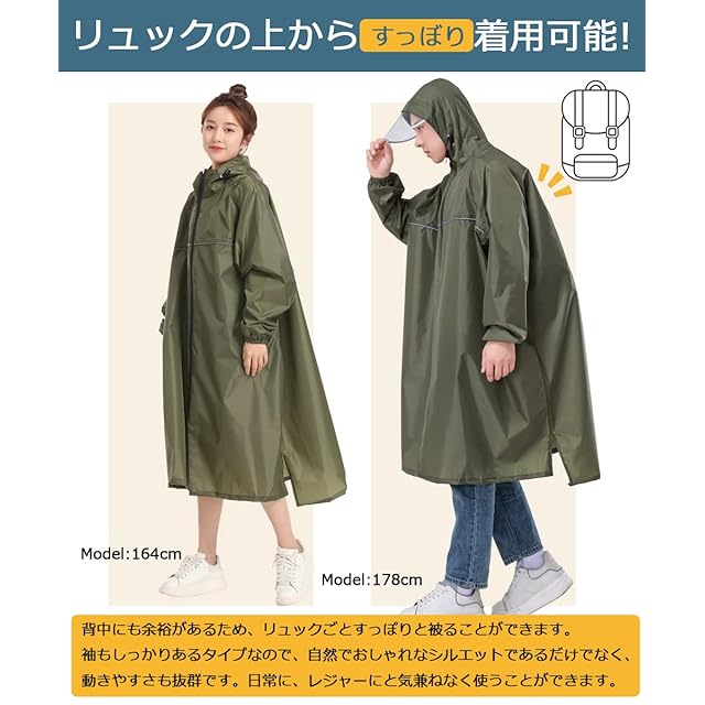【男女兼用フリーサイズ&ゆったりサイズ】 ユニセックスで着用していただけるよう落ち着いたカラー展開で、いかにもカッパというデザインでは無いのでアウター感覚で羽織っていただけます。普段レインウェアの出番が無い方でも、フリーサイズなのでご家族でシェアするのもオススメ。★リュックなど鞄を身に付け、その上に着ることができます。通学・通勤、保育園の送迎、バイク・原付、雪かき、犬のお散歩など、いろいろなシーンで活躍!