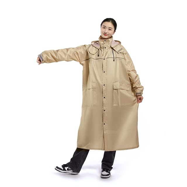 【袖口調節可能&反射帯付き&ロング丈·リュック対応着用可能】120cmと超ロング丈で、足元までしっかり覆えて雨を防ぎます。デザインは本来のレインコート式ではなく、ファッションアイテム脱ぎ着を楽にすることができ、レインコートの袖口に付けられたゴムギャザーやマジックテープで、袖口のフィット感が調節でき、雨や風の浸入を効果的に防ぎます。夜間の安全を考慮し、反射帯を前面から背面にかけて体を覆うように採用することで、車などからの視認性も高まり、夜間の自転車でも安全アップ。レインコートには収納袋を付属、レインコートを折りたたんで収納袋に入れお持ち運ぶことが可能で、便利です。