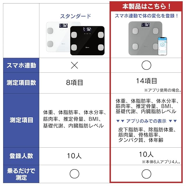 測定項目:体重、体脂肪率、体水分率、筋肉率、推定骨量、内臓脂肪レベル、基礎代謝、BMI※アプリのみでの表示:皮下脂肪率、除脂肪体重、筋肉量、骨格筋率、タンパク質、体年齢