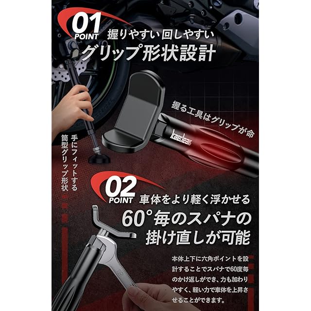 【コンセプト1】 握る工具はグリップが命、高価なドライバーなどはグリップの形状を力が掛かりやすく、回しやすい設計とすることで、通常のドライバーでは緩められなボルトも緩めることができるようにしています。Kaedearではグリップスタンドと命名し、本体中央にグリップ形状に設計しています。【コンセプト2】 工具はストロークが細かいほど良い。穴にドライバーを差して回す行為は整備学的に禁止行為で、コンクールなどでは危険行為として減点対象になります。またかけ返しが180度となり力も伝わりにくく、重たい場合も手で頑張って回すことに。そこで本体上下に六角ポイントを設計することでスパナで60度毎のかけ返しが可能になります。力も加わりやすいので、より軽く上昇させる事が可能です。早回しスパナや板ラチェを仕込めば更に快適にお使い頂けます。【ビジュアル&セーフティー】 目立つ色は工具の置忘れなどを防止するだけでなく、第三者に車両の状態を認識させる上でとても重要です。ブレーキホルダーとグリップスタンドにも目立つ赤のラインナップを用意しました。