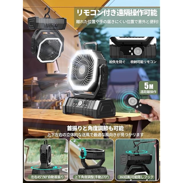 【35,000mAh・LED⨉ファン・首振り】SUKITEN キャンプ 扇風機 充電式 アウトドア扇風機 DCモーター 静音 コードレス 充電式ファン 吊り下げ 100時間連続使用 リモコン付き 切タイマー 風量4段階調節 3段階LEDライト 省エネ ポータブル 防災 キャンプ用品 車中泊/バーベキュー/アウトドア