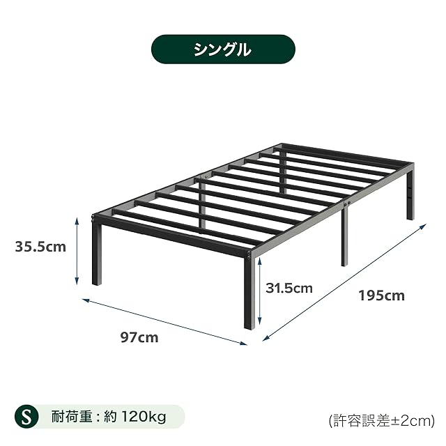商品サイズ:幅97cm×奥行195cm×高35.5cm、重量:10.53kg、ベッド下収納高:31.5cm、耐荷重:120kg、組立目安:15-30分(大人2人以上推奨)