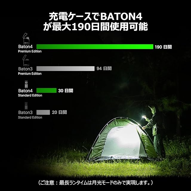 {1300ルーメン高輝度照明+最長190日間稼働} OLIGHT Baton 4の最大輝度は1300ルーメンで、アウトドアでも十分の明るさを提供でき、170mの最大射程に達し、緊急用、防災用、停電対策、日常生活などの様々なシーンにご適用しています。Baton 4 Kitはワイヤレス充電ケースも付っています。充電ケースには内蔵された高品質専用バッテリーの容量は 42% 増加されるし、Baton 4を5回ぐらい充電させます。充電ケースでBaton 4の使用時間が大幅に延長され、月光モードで最長190日間使用できます