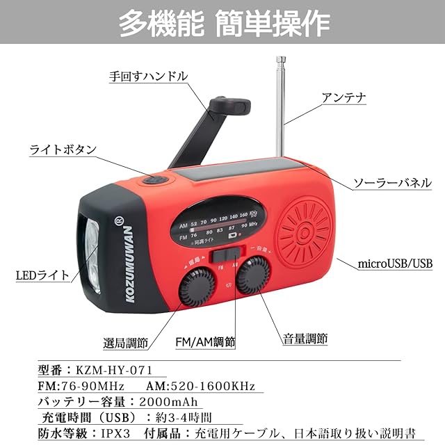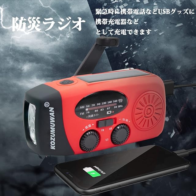 【3つの充電方法】 手回し充電手回しラジオ:製品の背面にあるハンドルを回すと充電可能。ソーラー充電ラジオライト:ソーラーパネルを日差しの方向に向けると、自動的に充電可能 USBケーブルで充電:付属しているUSBケーブルでUSBポートから充電可能