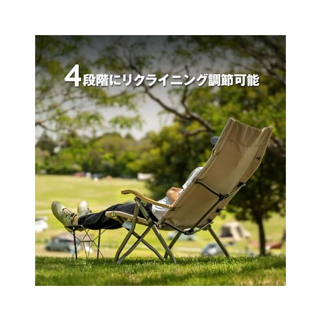 四段階のリクライニング機能:ハイバックの背面が四段階にリクライニング可能のアウトドアチェア。シチュエーションに応じて好みのポジションで寛げます。室内だけでなく、キャンプやバーベキュー、ピクニックで活躍します。