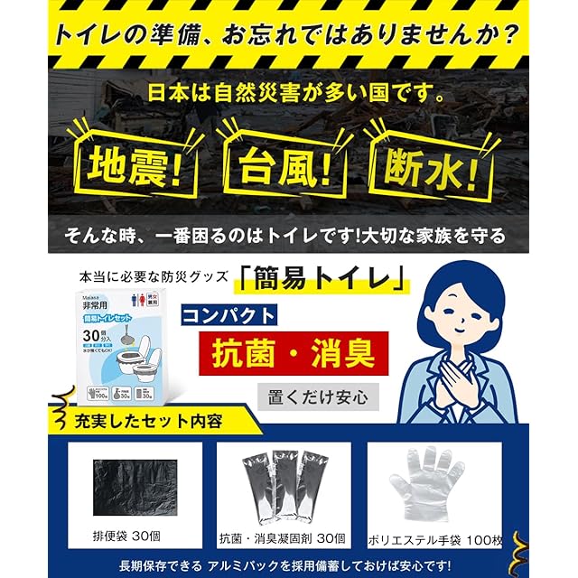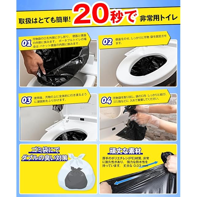 【災害に備える・安心の非常用トイレ】日常生活で何気なく使っているトイレが、災害時には使えなくなることは想像できますか?弊社の非常用トイレ は、そのような状況に備えて設計されました。30回分の使用が可能な大容量で、15年保存が可能。災害時にはもちろん、キャンプや登山などのアウトドア活動でも重宝します。また、凝固剤が付属しており、使用後の衛生管理も簡単です。安心して災害に備え、日常生活を楽しむための非常用トイレ をぜひお試しください。使用期限 2039年3月