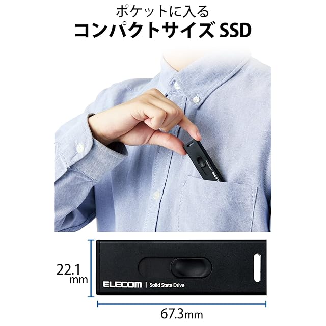 キャップレスでキャップを紛失する心配がなく、スムーズにスライドできる機構のスライド式外付けSSDです。