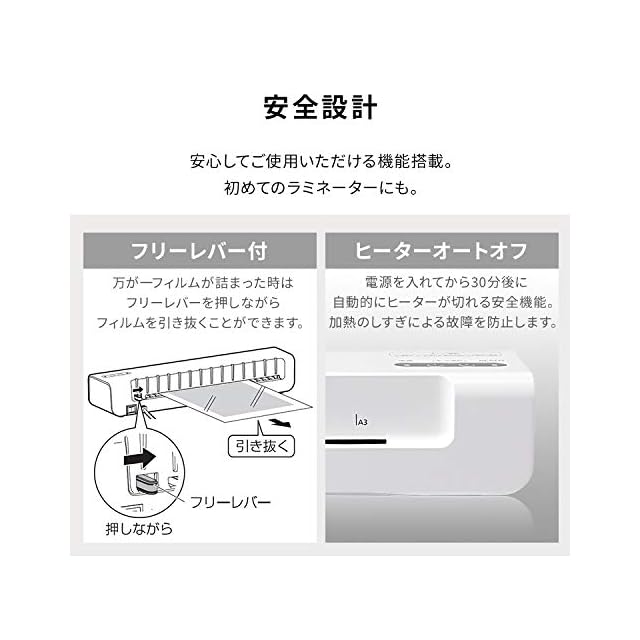 最大ラミネート幅:33cm最大ラミネート厚:0.4mmラミネート速度:約230/280mm(50/60hz)