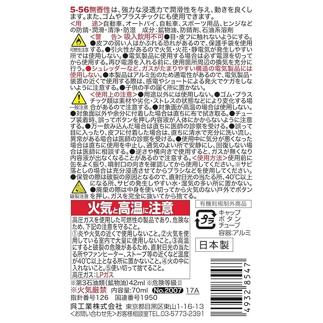 商品名:KURE(呉工業) 5-56 無香性 70ml 防錆・潤滑剤 2007