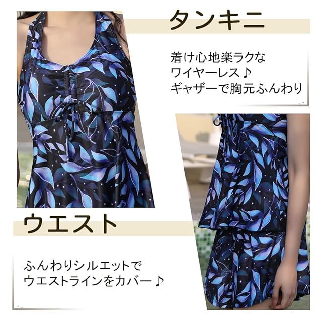 [TaoTech] 水着 レディース タンキニ 体型カバー 4点セット カバーアップ オーバーTシャツ ショートパンツ ママ水着 (M, ブラック×ブルーリーフ)