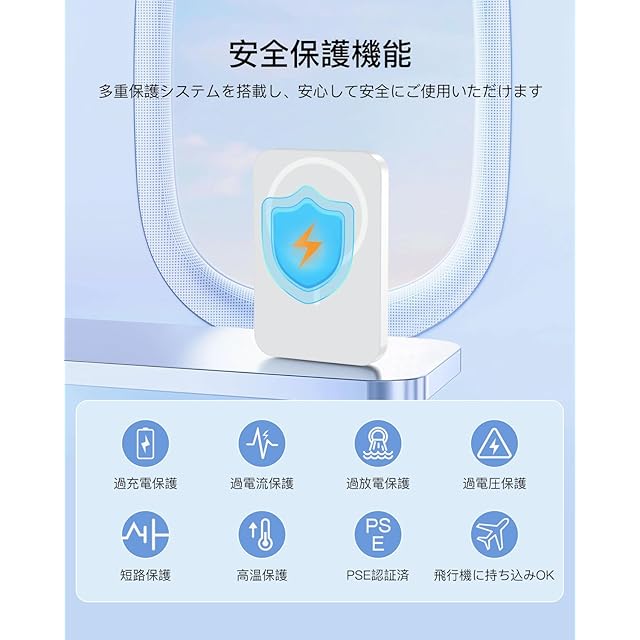 【PSE認証・多重保護システム装置】当社のモバイルバッテリーは高品質の内蔵バッテリーコアを採用し、過充電保護、過熱保護、過放電保護、過電圧保護、ショート保護など、複数の安全保護装置を備えており、モバイルバッテリーの安全性を確保しています。さらに、当社の製品はPSEの安全認証を取得しており、品質が信頼できます。パッケージには、マグセーフ モバイルバッテリー*1、Type-Cケーブル*1、日本語の説明書*1 が含まれています。製品をご使用中にご質問がある場合は、いつでもお問い合わせください。1年間のアフターサービスを提供しており、当社の製品を安心してご利用いただけます。