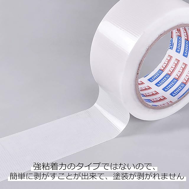 養生テープの採用基材:ポリエチレンクロス、粘着剤:アクリル油、テープの厚さ:0.16mm、粘着力:1.7N/cm(弱粘着)、引っ張強さ:30N/cm、伸び率:10%