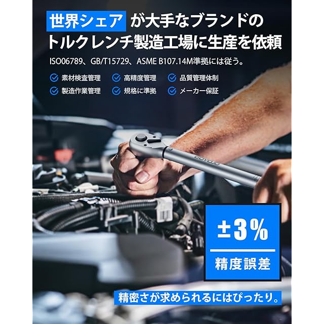 【高精度・多サイズ選べられ】大手なブランドのトルクレンチ製造工場に生産を依頼ISO06789、GB/T15729、ASME B107.14M準拠、精度誤差±3%。更にさまざまなサイズ/ソケット選べられます。設定範囲内であれば自由にトルク値の設定ができて、用途にあわせて選ぶと効率よく作業できます。