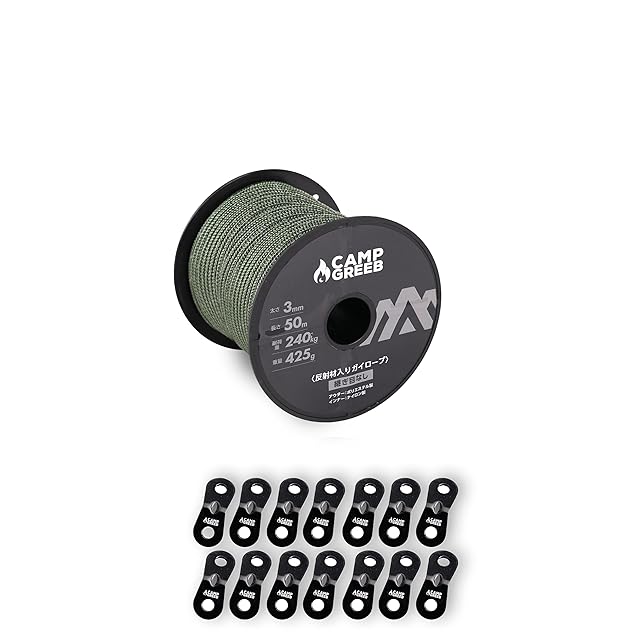 キャンプグリーブ 反射材入りパラコード 3mm/4mm/5mm ガイロープ 30m/50m巻 耐荷重240kg/350kg/420kg 自在金具12個付 継ぎ目なしノーカット テントロープ キャンプ (50, アーミーグリーン/3mm)