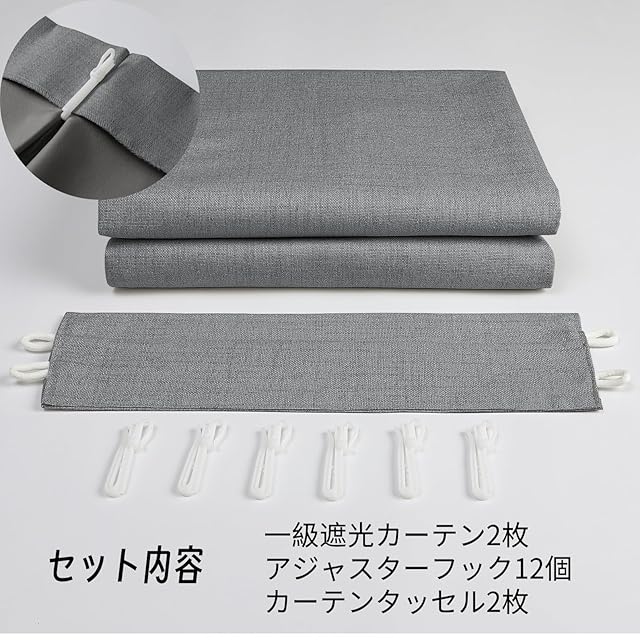 【商品仕様】遮光カーテン*2枚、カーテン用アジャスターフック*12個、カーテンタッセル*2