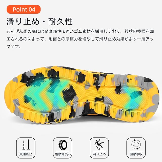 滑り止・耐摩耗:作業靴として、耐摩耗性に優れたゴム素材と滑りにくさを考慮したアウトソールを採用します。底も滑り止めデザインで効果が向上させます。