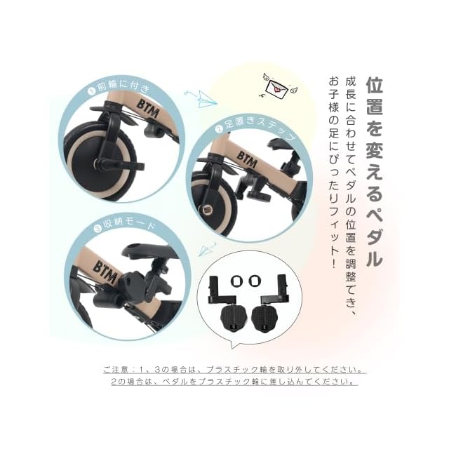 【一台4役】手押し三輪車モード、三輪車モード、ランニングバイクモード、自転車モード。様々な使い方があり、工具なしで組み合わせできです。お子様の成長に合わせて7階段でご使用いただけます。