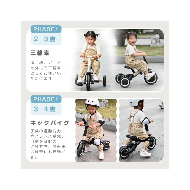 【一台4役】手押し三輪車モード、三輪車モード、ランニングバイクモード、自転車モード。様々な使い方があり、工具なしで組み合わせできです。お子様の成長に合わせて6階段でご使用いただけます。