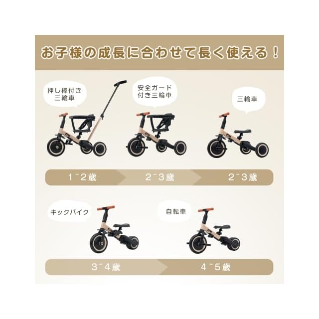 【5IN1多機能一台五役!】お子さんの成長に合わせてパーツを変更することで、手押し三輪車モード・ペダルのない足けりモード・通常の三輪車モード・自転車モード・二輪のバイクモードの5つのモードで遊べます。工具なしで組み合わせできです。お子様の成長に合わせて5階段でご使用いただけます。