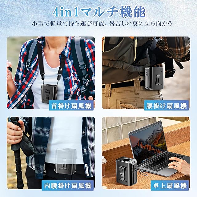 【5in1多機能ファン】:携帯性がありながら多機能です。ベルトやパンツに取り付けて体を冷やすためのウエストハンギングファンとして、また夏の旅行中に手を自由にするための首掛けファンとして使用することができます。さらに、モバイル電話を直接充電するためのモバイルバッテリーとして、LEDライト、SOSライト、デスクトップファン、ネックファンとしても使用することができます。