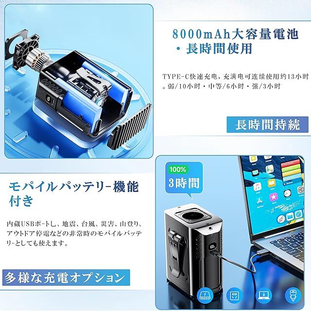 【8000mAh大容量バッテリー】最長20時間連続稼働! 高容量リチウム電池搭載で、フル充電後は最大20時間使用可能(弱風モード時)。USB充電式で充実の携帯性を実現。