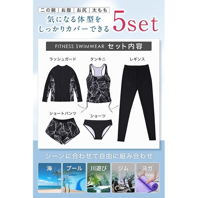 ✅【様々なシーンで大活躍の5点セット】タンキニ、ラッシュガード、ショートパンツ、ショーツ、レギンスの5点セットです。海、プール、ジム、フィットネスなどいろんな場面でご利用いただけます。
