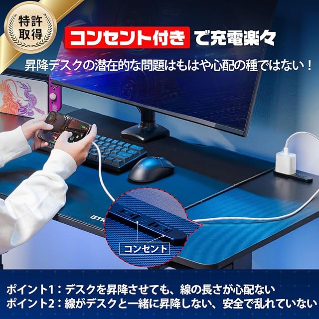 【スライドカバー付きの便利なコンセント】2つのコンセント口で手軽に充電できます。デスクを昇降させても、コードが短くてコンセントに届かない心配はありません。さらに、スライドカバーは自動的に閉じるため、使用しないときは防塵や防水に役立ちます。
