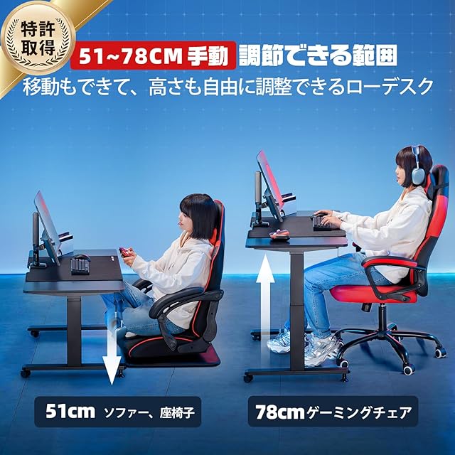 【唯一無ニの手動式昇降ローデスク】電動昇降デスクはコンセントの設置場所に制限があるため、好きな場所に置ける特許を持つ手動昇降デスクを開発した。「51〜78cm調節」×「スムーズな昇降」×「カーボン調の天板」×「専用マット付き」×「前に2つのロック可能なキャスター+後ろに2つの高さ調節可能な固定脚」×「SPCC鋼材採用」×「スライド式コンセント付き」で、強度と安定性を確保し、様々な機能を追加した。レバーを片手で軽く回すだけで、昇降もスムーズだ。