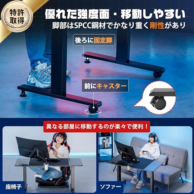 【移動スムーズで、強度面もある】コンパクトで、51〜78cmの範囲でスムーズに昇降できる。ソファやゲーミングチェアに合わせて設置場所を簡単に変更可能。デスクの前にはロック可能なキャスターがあり、移動が便利。持ちやすく移動しやすいデスクの後ろには、高さ調節可能な2つの足があり、起伏のある地面でも安定する。SPCC鋼材を使用した脚は耐久性が長い、子供の成長もと共にできる