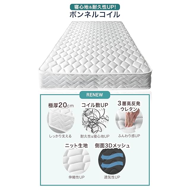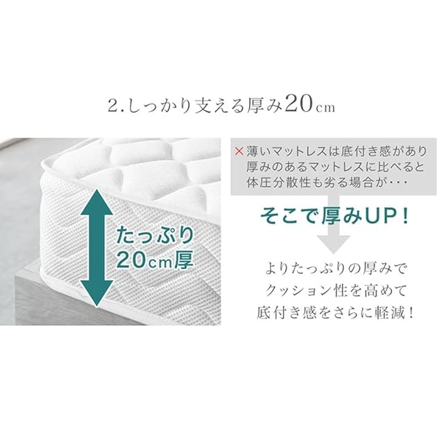 【備考】 ※マットレスの上で飛び跳ねたりしますと、コイルの破損や怪我の原因になりますので、お避け下さい。 ※マットレスは柔らかい素材で作られてますので、保存期間中の置き方や運搬の仕方、また測り方によって多少サイズに誤差が生じる場合がございます。予めご了承下さい。。※モニター画面の設定、または解像度などにより現物と色・質感が若干異なって見える場合がございます。 ※当商品は圧縮梱包でのお届けの為、厚み20cmに復元するのに時間がかかる場合がございます。 ※2024年9月10日より、【セミダブル・ダブル・クイーン】サイズに【厚み20cm】タイプを追加しました。 ※2024年9月27日より、【シングル】サイズに【厚み20cm】タイプを追加しました。 ※2024年10月4日より、【厚み17cm】タイプの販売を終了しました。