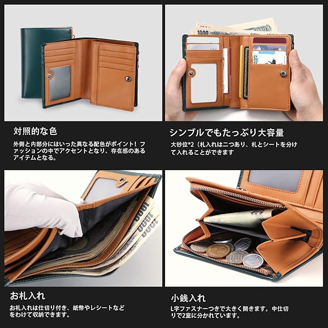 【財布 コンパクト 大容量で、収納抜群】:カード、お札、コインケースと分かれた収納は、 クレジットカードや領収書などがしっかり入り、管理しやすく便利です。L字型ファスナー式小銭入れで、コインの出し入れはしやすいです。