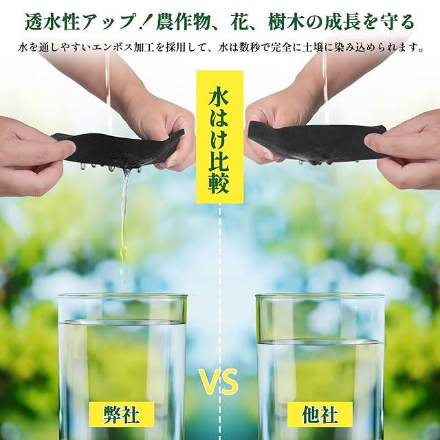 【透水性アップ】弊社の防草シートは浸透性にも優れ、雑草の育成を防ぎながら水はけのよさも定評があります。液体肥料や水を透過させることができるため、大事な草花などを枯らす心配がありません。雨の日も雨水がたまりにくいです。空気を良く通すことから土に影響を与えない。土の栄養を維持し、農作物、花、樹木の成長を守ります。ポリプロピレンを使用した高密度不織布を使っているため、耐久性は良好。はさみでカットしても端からほつれることもなく、DIYが苦手な方でも手軽に設置できます。