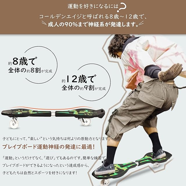 【滑り止め性能に優れたデッキ】ブレイブボードのサイズ:86*22*10CM 重量:約3KG 耐荷重:約60KG 複数の滑り止め粒子のデザインは、より高い滑り止め力を提供します。ブレボーのパターンは特別の「熱転写技術」で印刷され、はっきりしていて、長く時間で色褪せないです。