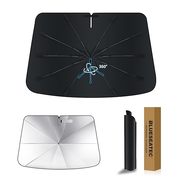 【360°回転可能&次世代の特殊生地】傘柄は360°回転可能で必要に応じて調整できます。従来品のステンレス鋼の傘ハンドルより、ダッシュボードなどの内装を傷からスッキリ守ります。TiO2チタンシルバーコーティング・アイスクリスタル冷却生地を採用、太陽光を強烈にはね返します。従来品は材質が薄く、遮光性が弱い。本製品は厚い銀生地が採用され、遮光率がアップ。なお、普通のは銀色の面が内装と擦れる事で内装に色写りします。