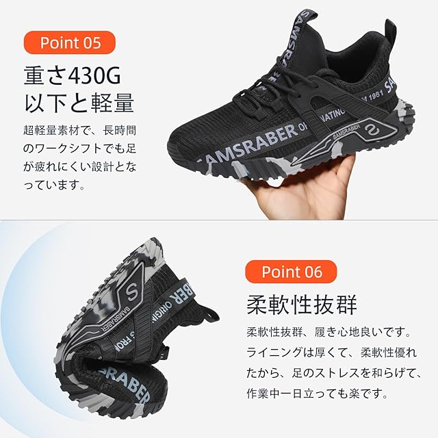 滑り止・耐摩耗:作業靴として、耐摩耗性に優れたゴム素材と滑りにくさを考慮したアウトソールを採用します。底も滑り止めデザインで効果が向上させます。