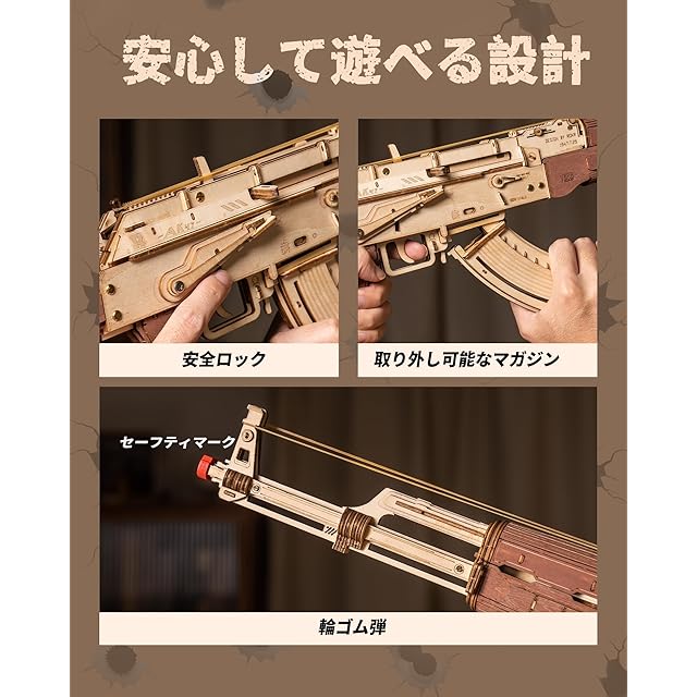 「発射機能」この3D木製パズルキットには、ゴムバンドの弾丸銃を使用して実際に発射することができます。組み立てが完了したら、ゴムバンドを装填して遊び、連射や単発射撃を楽しむことができます。