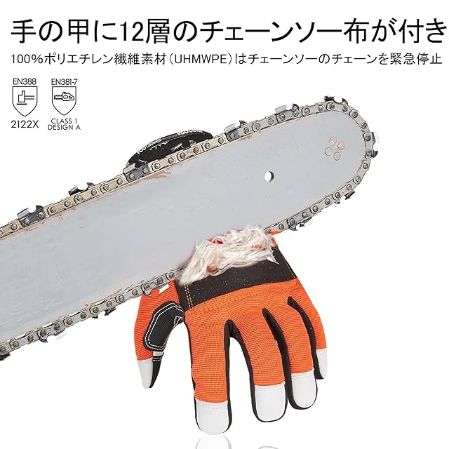 【チェーンソー保護用高強度防刃】 両手の甲の部分はさらに特別な保護層を施し、チェーンソーから左手を保護し、EN381-7規格、クラス1.20m /s