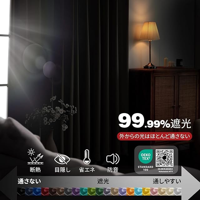 【1級遮光】三層1級遮光素材(JISにより遮光度99.99%以上)で、日光や街灯の光をしっかり遮断します。室外陽光阻まれて、たとえ猛暑が続くても、薄暗く涼しい雰囲気を持っています。UVカットほとんど100%紫外線をカットできるので、フローリングや家具の日焼け防止もおすすめです。夏は強い日差しを遮断し室内温度の上昇を抑え、冬は室外の寒気を遮り、省エネ効果が期待できます。色によっても遮光性に異なるため、同じ1級遮光カーテンでDeconovoからの濃い色の選んで遮光効果もっと良いです。