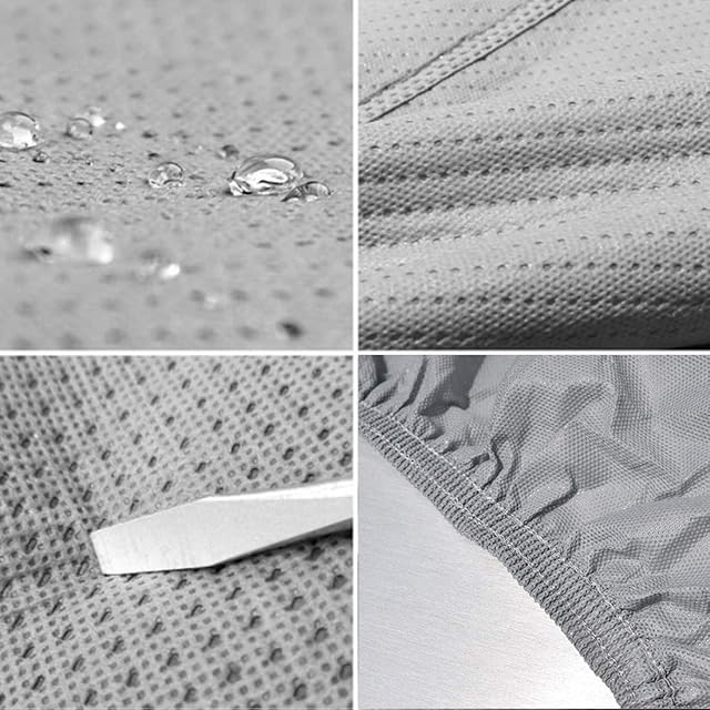 【4層構造】外層防水ボディカバー:環境にやさしい高密度不織布(重:160g/m2)を使用します。これは防湿性があり、手触りが軽くて柔らいです。中層:PPフィルムと二層高比重不織布で,空気を通し、防水性能がもっと良いです。内層:さらに柔らかい感触の裏起毛素材で、強風がボディカバーを巻き起こして車を擦傷することを防ぐことができます。