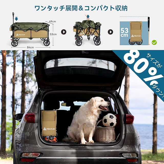 HIKENTURE キャリーワゴン 【大容量135L・耐荷重150㎏】アウトドアワゴン 【スイベル・ブレーキ付き】キャンプ カート 特許取得のコンパクト設計 キャンプカート ワンタッチ収束型 自立式ハンドルデザイン キャンプ キャリー レジャー BBQ 運動会 荷物運び 引っ越し