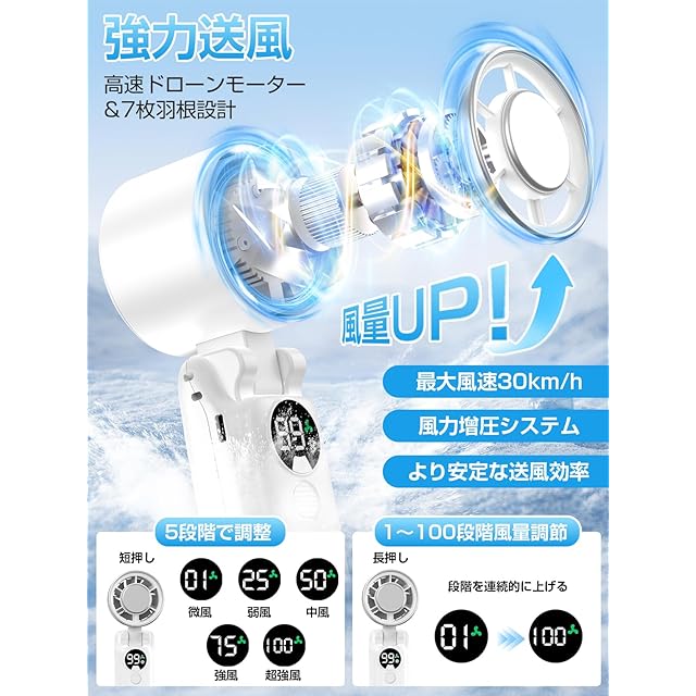 【強力送風・100段階風力調節・7枚羽根】小さいのにパワフル送風できるハンディ扇風機です。空気力学に基づいた超小型ファンヘッドは、高速回転モーターが内蔵されており、風力の分散を抑制しながらより強力な風を送ることができます。通常のハンディファンよりも送風効率を向上させます。1-100段階風量調節により、自然に近い優しい風からパワフルな超強風まで細かく切り替えることが可能です。【風量調節方法】①短押し:起動後、電源ボタンを1回押すごとに風量を微風(01)・弱風(25)・中風(50)・強風(75)・超強風(100)に切り替わります。②長押し:起動後、電源ボタンを長押しすると、風量を無段階で連続的に上げることができます。お好みに合わせて風量調整方法を自由に選択できます。この小型扇風機は7枚羽根を採用し、羽根全体を流線型デザインにすることで空気抵抗を減らし,運転騒音を抑えながらモーター寿命を延長します。
