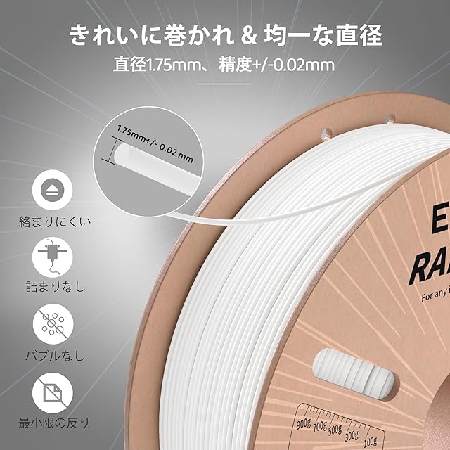 【最高の精度と一貫性】精密な製造工程により、直径1.75mm、精度±0.02mmのフィラメントをします。厳格な公差と完璧な寸法精度は、フィラメントのスムーズで一貫した供給をします。