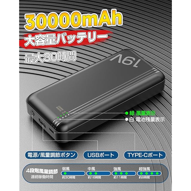 【30000mAh超大容量バッテリー】長袖空調作業服は30000mAhの大容量バッテリーが付属し、暑い環境でも長時間使用可能。最大出力電圧19Vで、圧倒的な風量を生み出し、瞬時に体温を下げ、極上の涼しさを実現します。風量モードにより使用時間は約8-30時間になります。また、PSE認証を取得していますので、安心してお使いいただけます。