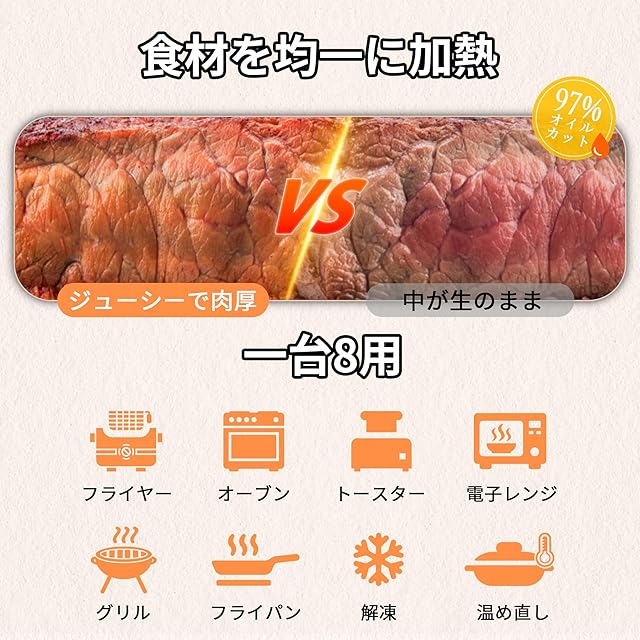 【より健康的な調理法】 最小限の油を使用して食材を調理し、カロリーと脂質の摂取を効果的に減少させ、最大で脂質を75%削減します。同時に食材の栄養成分を正確に保持し、より健康で美味しい食事を提供します。
