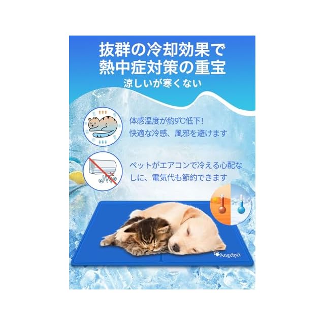 【優れた冷却効果】マット内のジェルがペットの体温を吸収・放散し、冷感を長時間維持します。ペットの体感温度を約9℃下げ、適度な冷たさを保ちながらペットの健康を守ります。猛暑の中でもペットの熱中症対策に役立ちます。全身を毛で覆われたペットにとって、ひんやりマットは夏の必需品です。